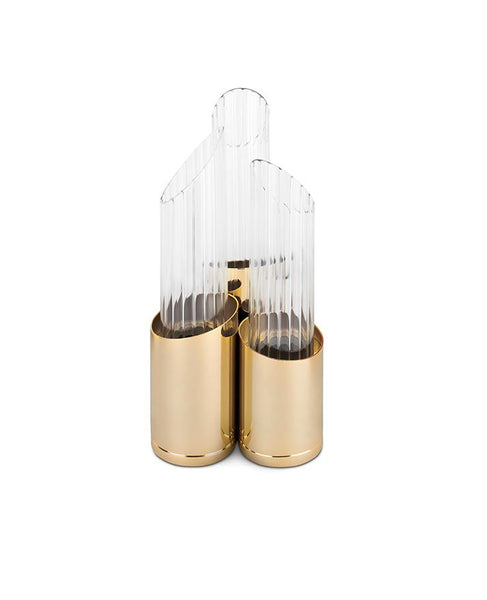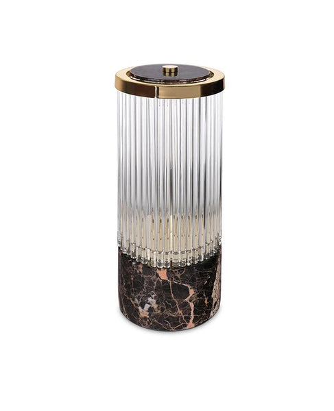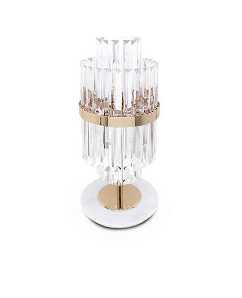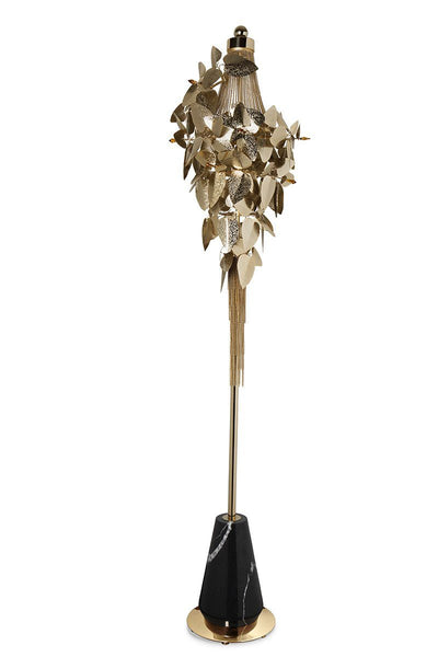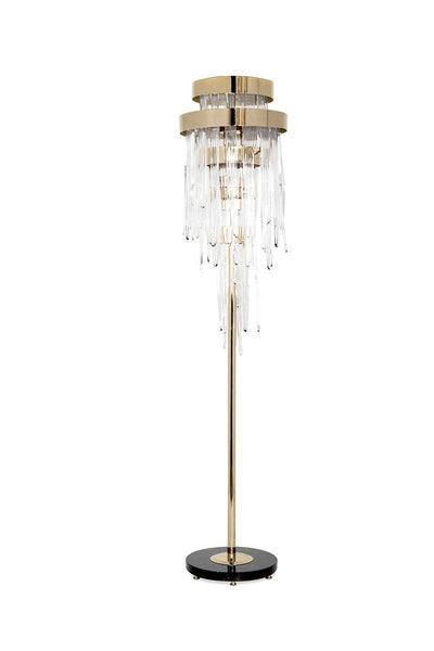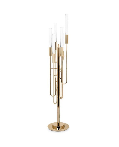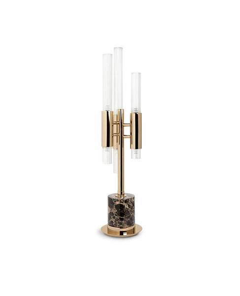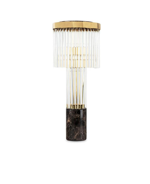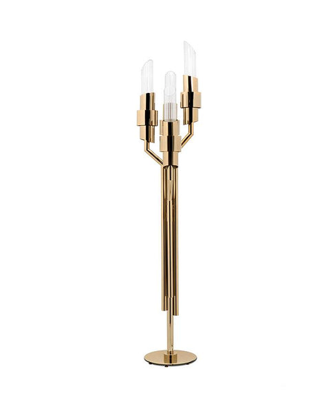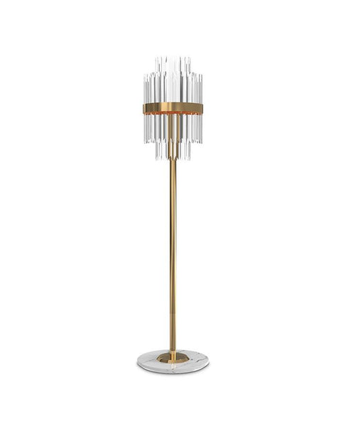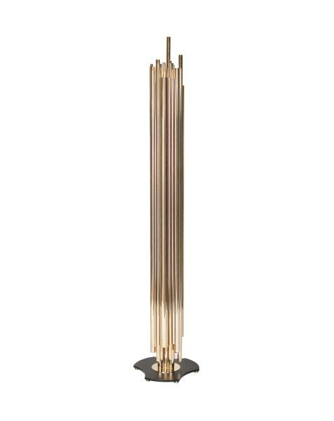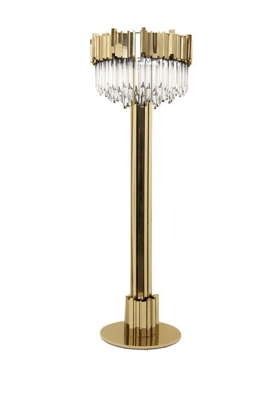 The Pharo Floor Lamp is inspired by the Pharos Lighthouse. Designed in a simple and robust style and made of brass and crystal, this piece takes both the architecture and the symbolism of lighthouses into account and is able to light up any space as a beacon.